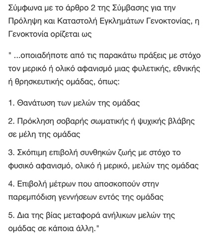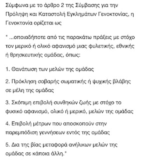 Γενοκτονία: Οποιαδήποτε πράξη με στόχο τον μερικό ή ολικό αφανισμό μιας φυλετικής, εθνικής ή θρησκευτικής ομάδας.